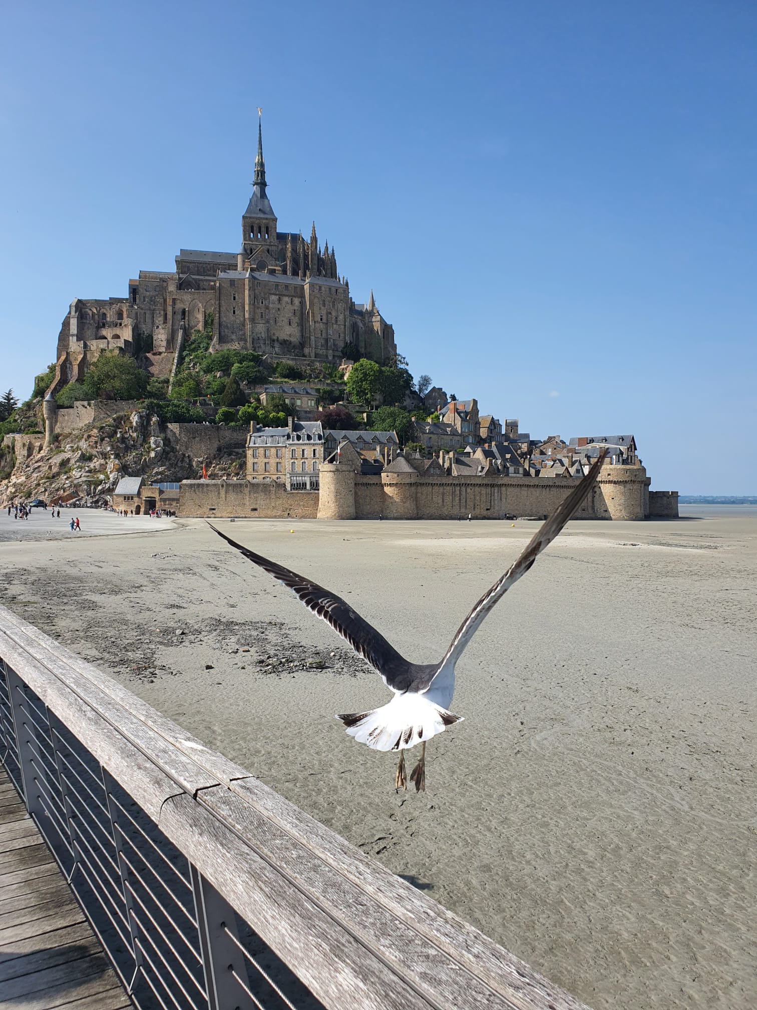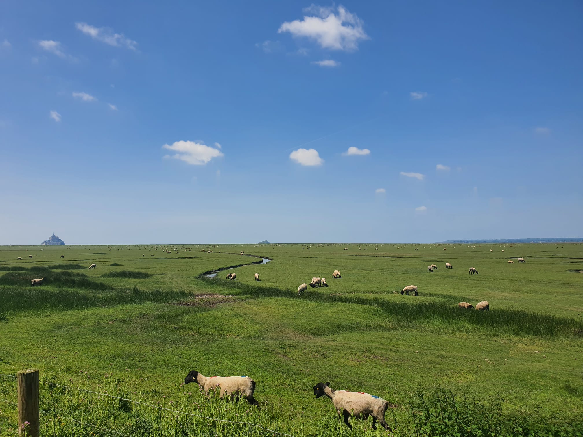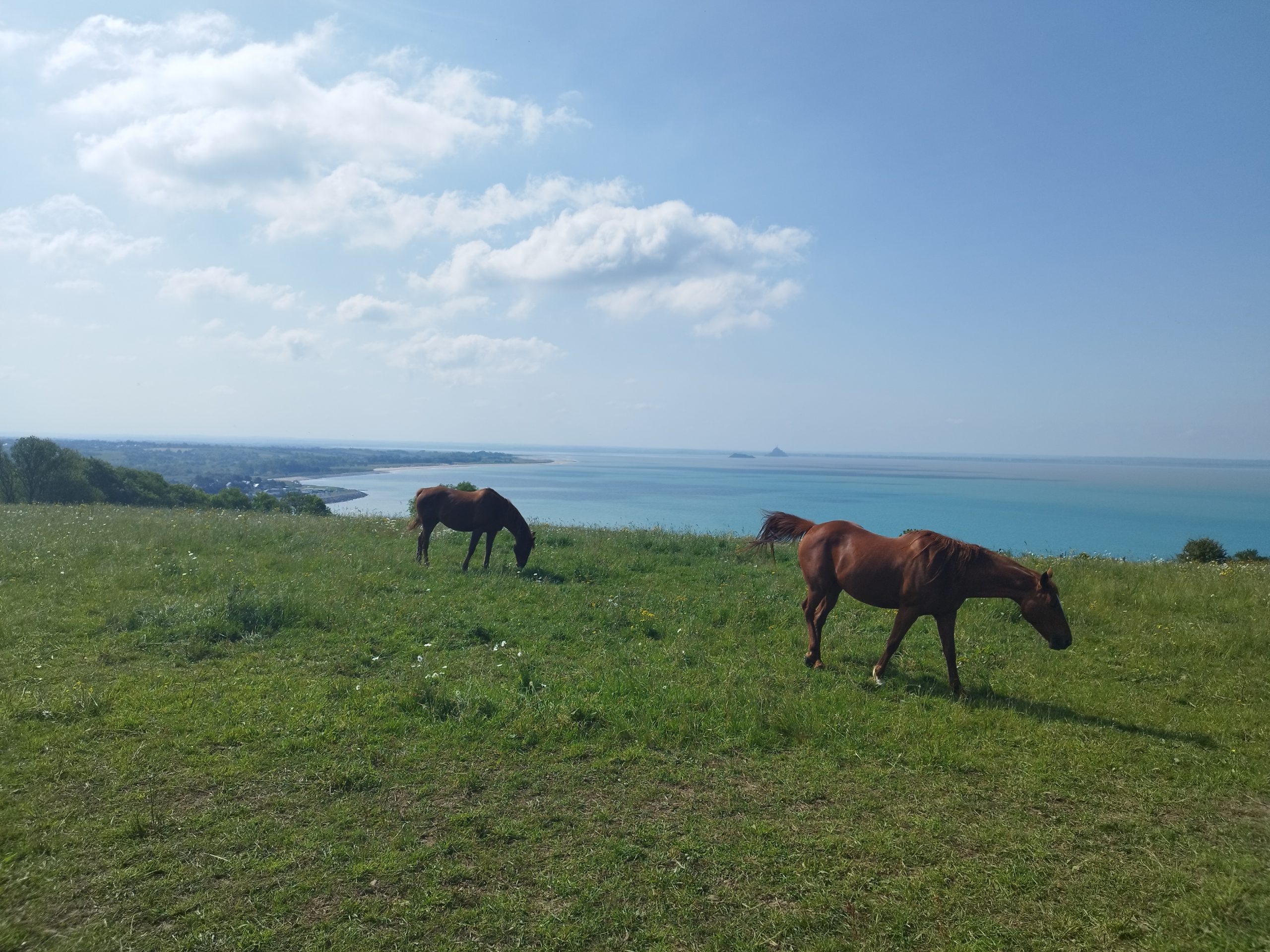 Plus à l’ouest, la côte du Cotentin révèle un visage plus sauvage et préservé, avec ses landes, ses bocages et ses petits ports nichés à l’abri des falaises. Les voies vertes serpentent à travers prairies et marais, offrant des moments de calme absolu au cœur d’une nature généreuse et authentique. L’étape finale normande, de Granville au Mont-Saint-Michel via la route de la Baie 911, a été un moment fort de mon voyage. Depuis les collines de Champot, le Mont-Saint-Michel se dessine lentement à l’horizon, grandissant au fil des kilomètres pour offrir un spectacle inoubliable avant l’arrivée.